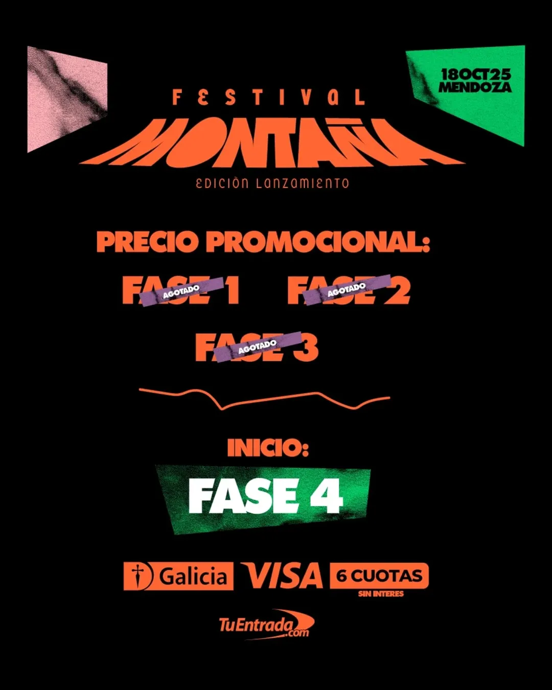 El Festival Montaña debuta este año y viene generando gran expectativa: las fases 1, 2 y 3 de entradas ya se agotaron, y actualmente queda disponible la Preventa 4, con valores de $65.000 la general y $200.000 la VIP. Los tickets se consiguen online en tuentrada.com (hasta en 6 cuotas sin interés con Visa Banco Galicia) y de forma física en Moicano Rockería y MaxiMall (solo en efectivo).